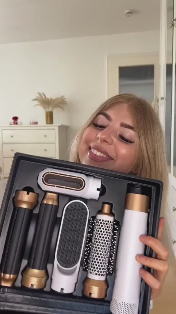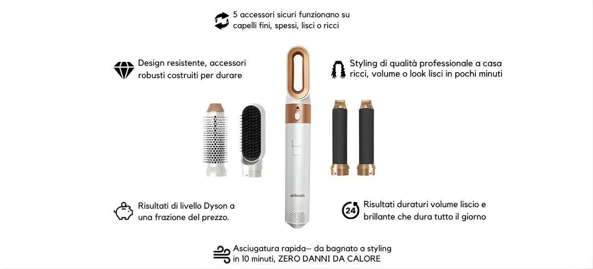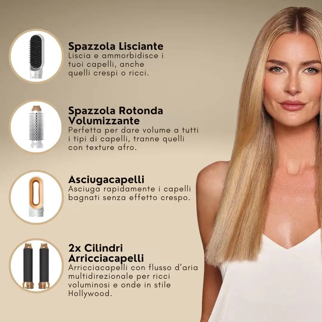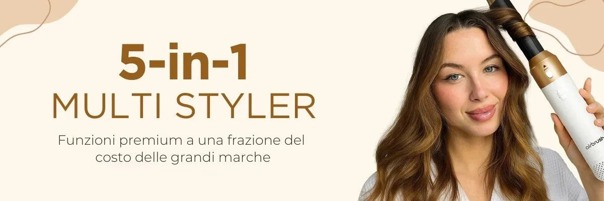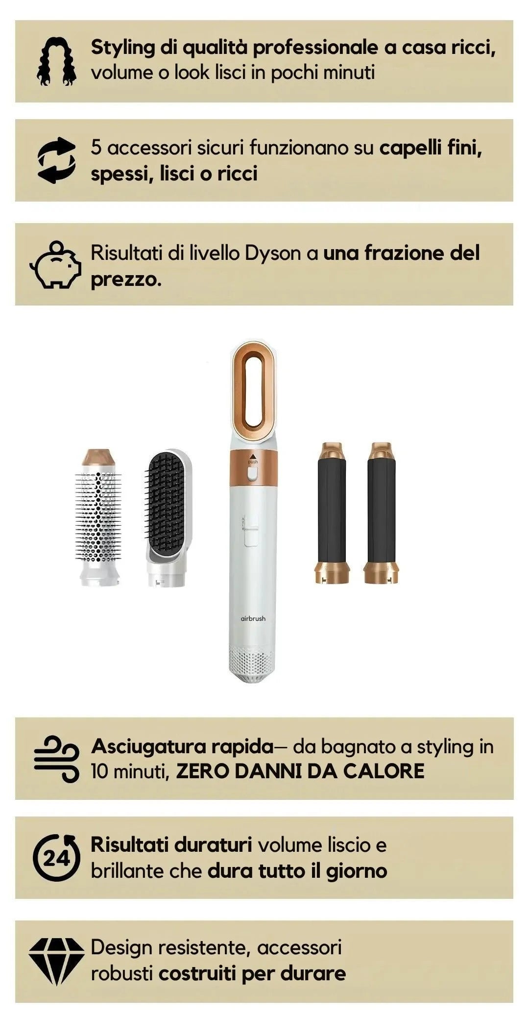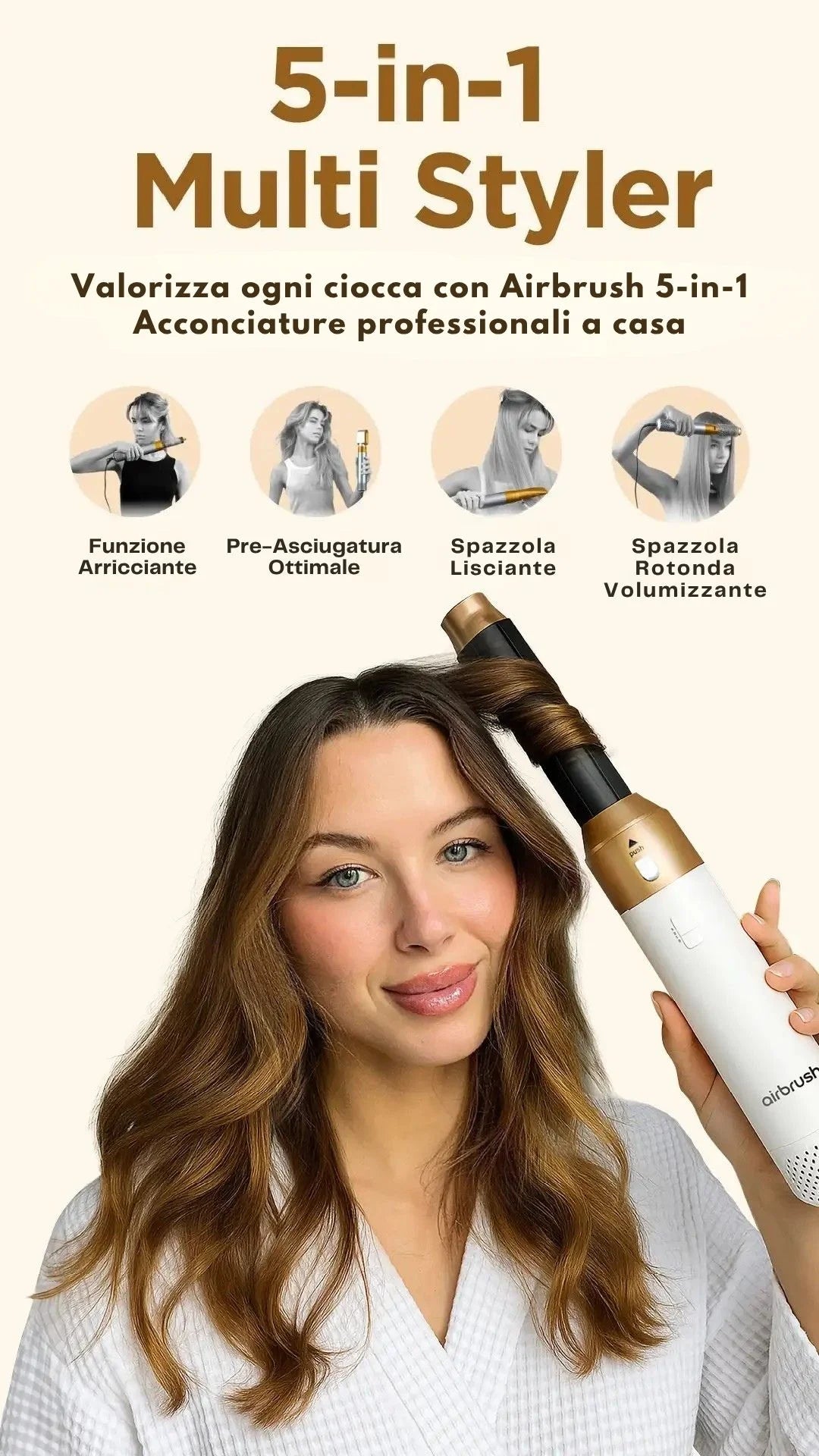 Il 5-in-1 Multi Styler include diversi accessori intercambiabili: ferro arricciacapelli, spazzola lisciante, pettine riscaldato e altri.